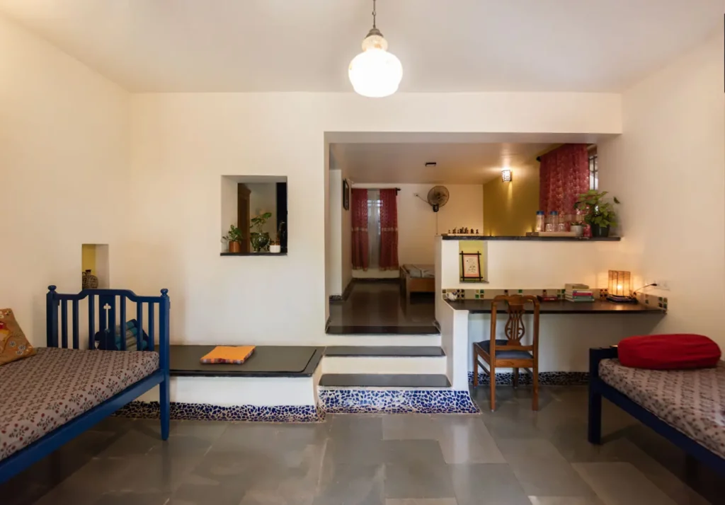 Experience Kamshet’s best stay option at the Indian Coral Tree Room at Native Place, a perfect blend of space and comfort inspired by the lush orange-scarlet foliage of the Indian Coral Tree. This room includes a bedroom and a living room area, making it ideal for families or large groups. Enjoy the airy veranda that offers a splendid view of the garden, providing a serene backdrop for relaxation. Surrounded by trees that house melodious birds, the room also overlooks the food forest.